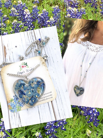 Inspired by Boho style - long Texas Bluebonnet heart pendant necklace.