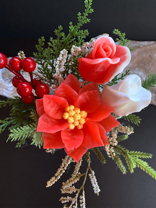 This Christmas arrangement with poinsettia soap roses, red berries and greenery is perfect to decorate...
