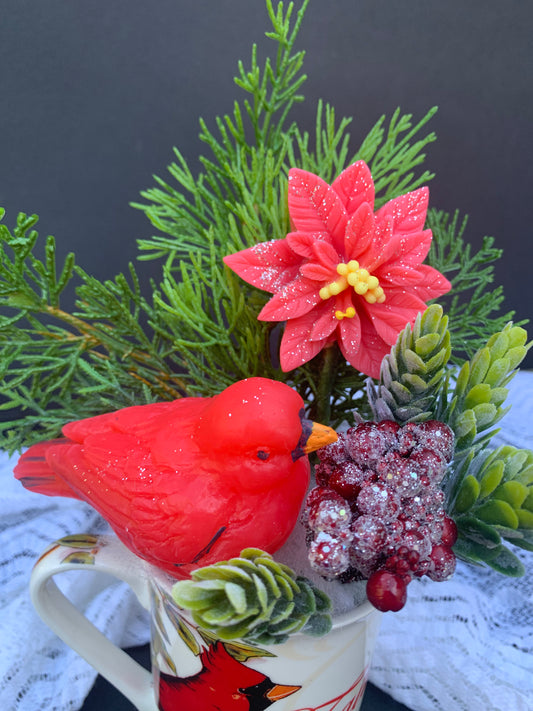 When cardinals appear, loved once are near. This Christmas arrangement with red Poinsettia soap flower,...