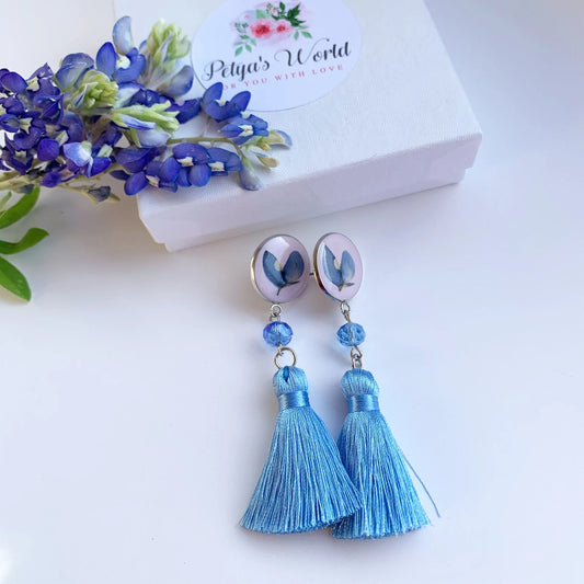 Absolutely beautiful tassels earrings made with Real Texas Bluebonnet flowers and Czech crystals. Handmade item...