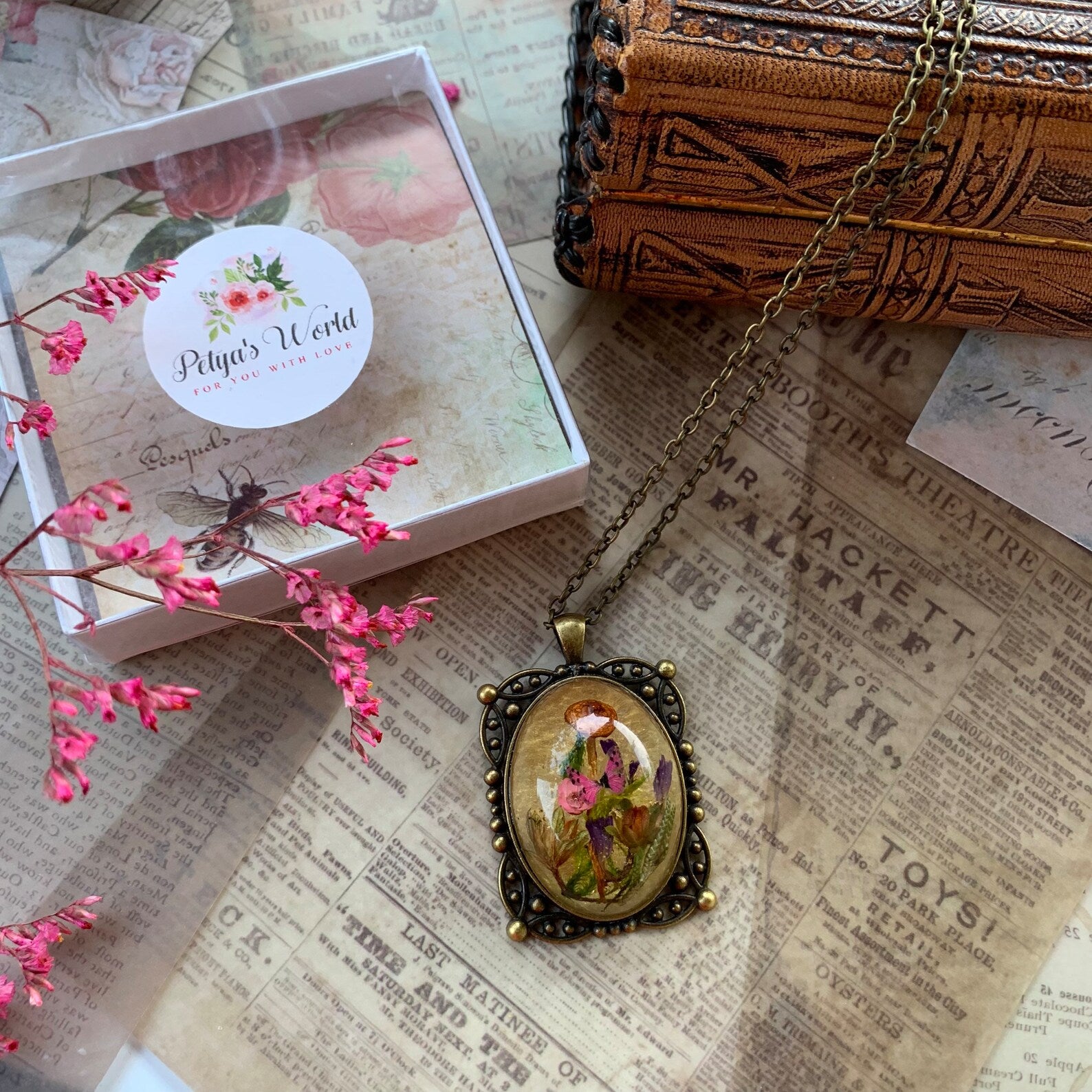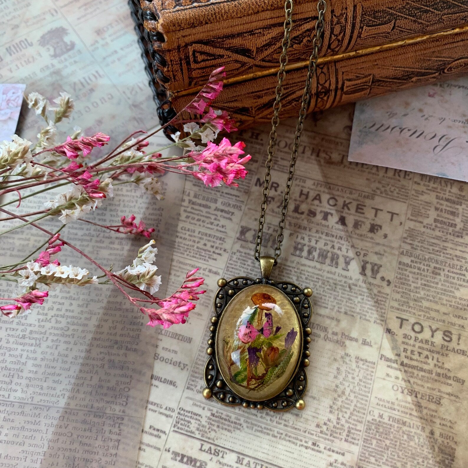 Antique style woodland necklace, Real flowers necklace, Mushrooms necklace