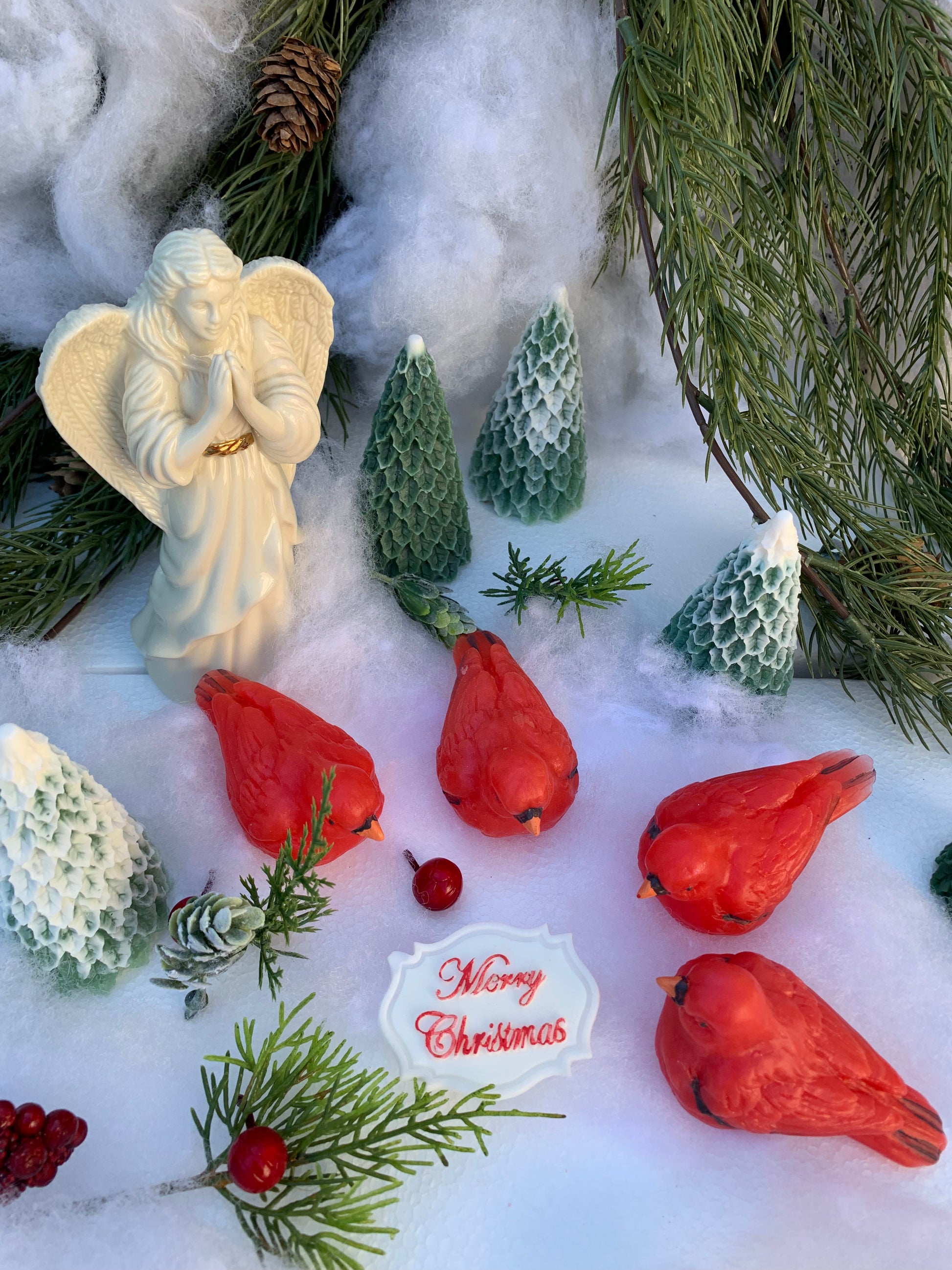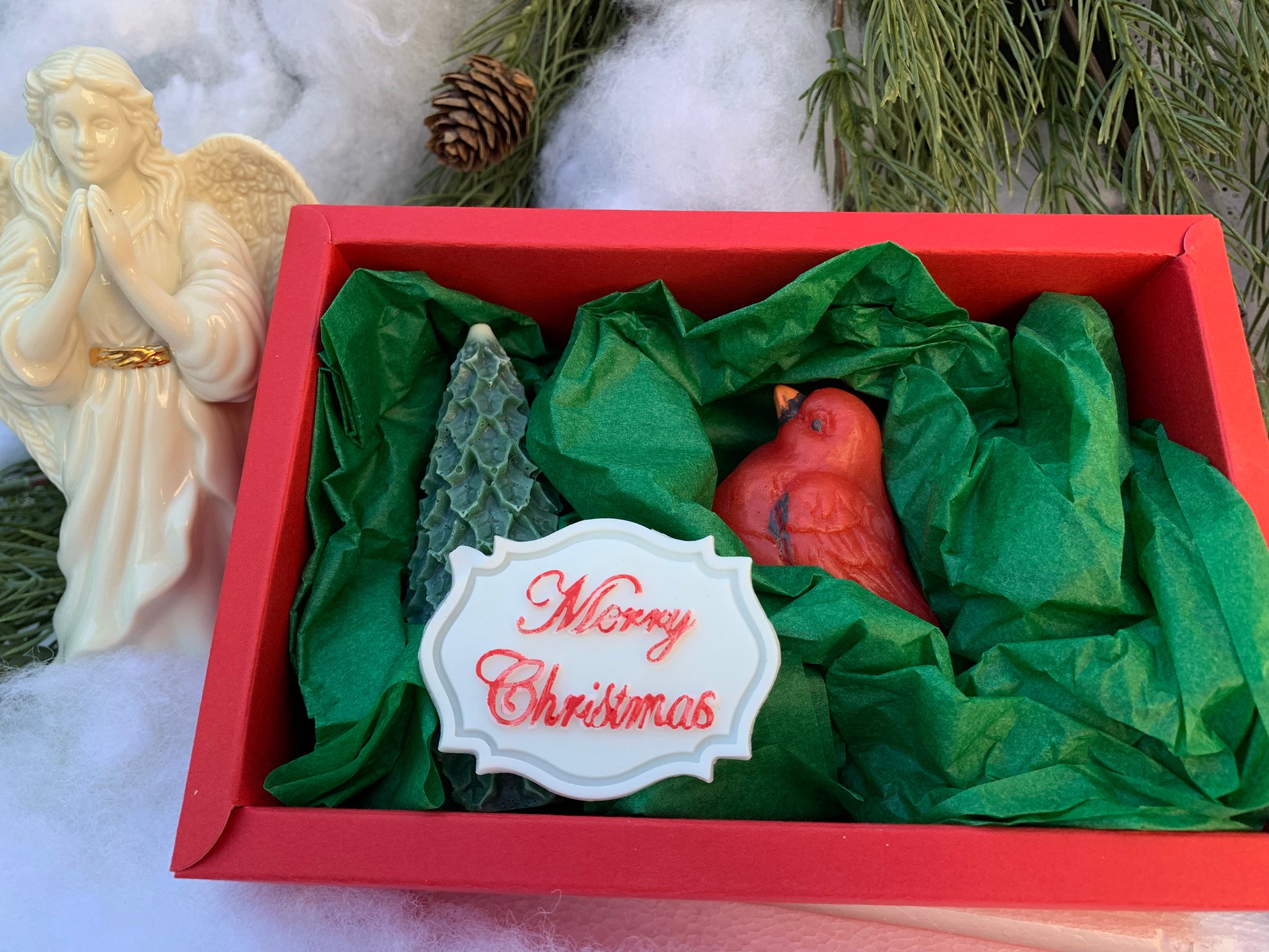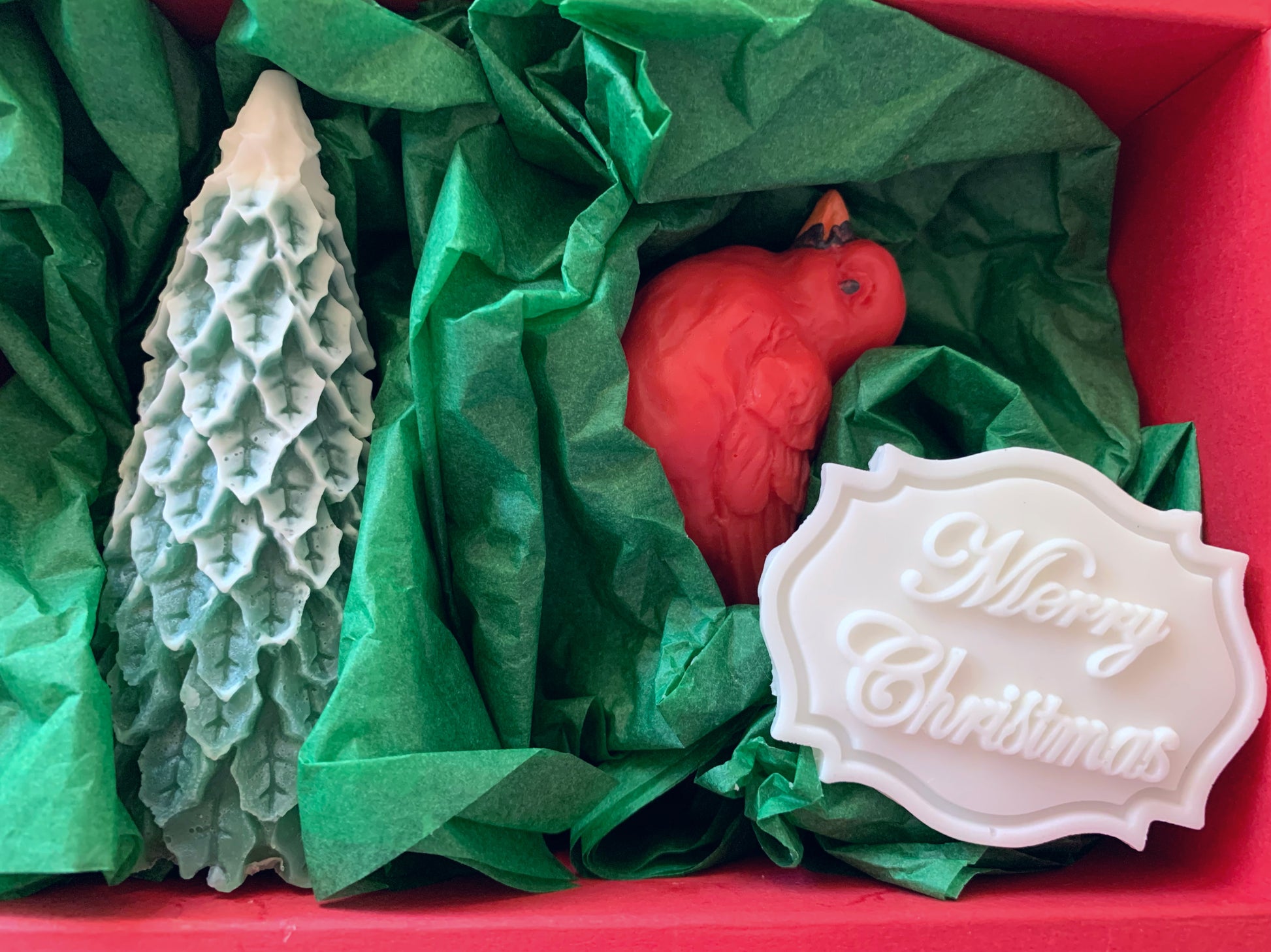 - It contains 1 Christmas tree shaped soap, 1 Cardinal bird shaped soap and 1 Merry Christmas white soap tag.