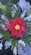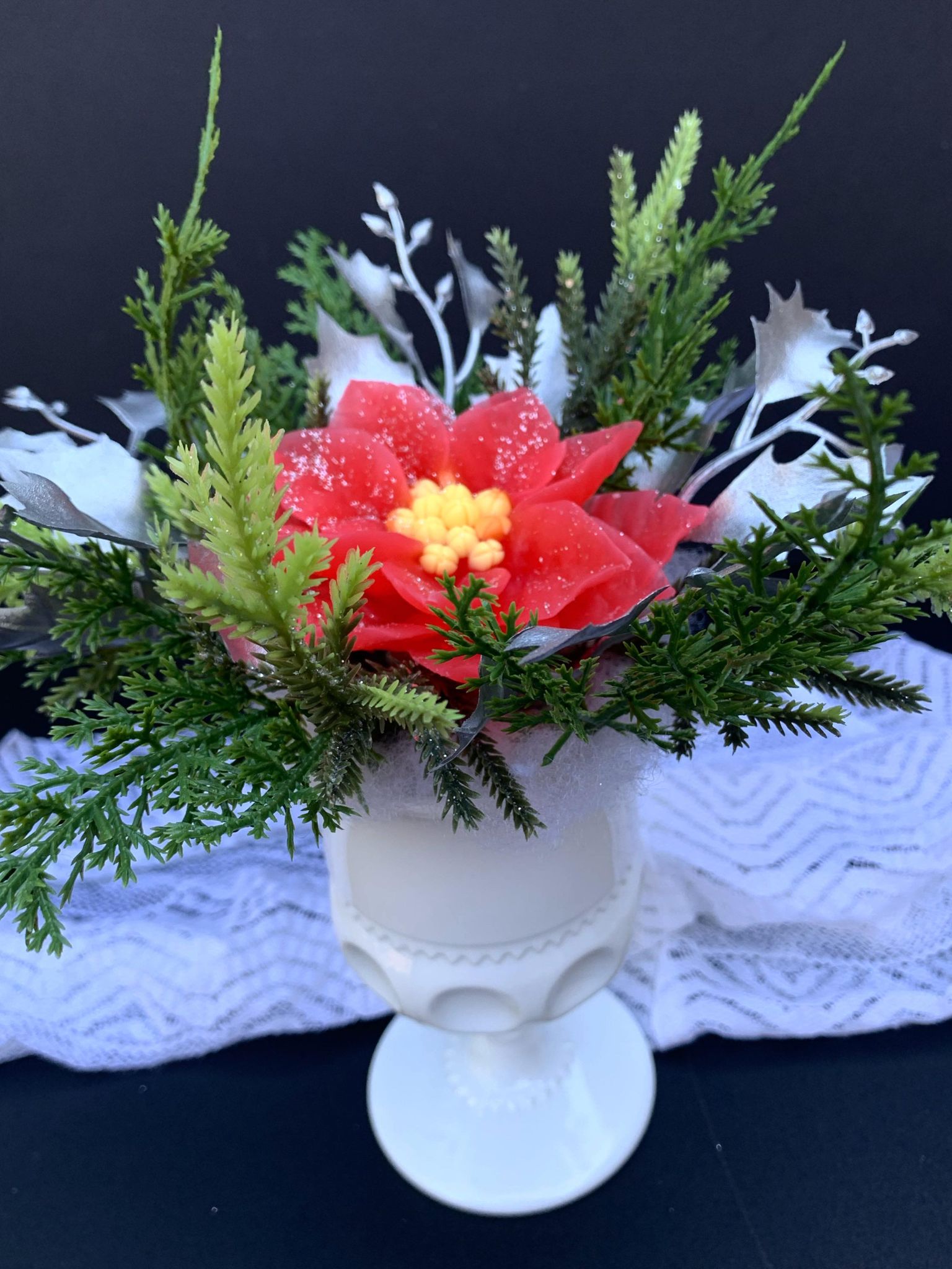 - This single soap poinsettia arrangement with green christmas tree brunches and silver leaves is perfect to decorate your home for the Holidays.
