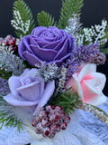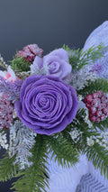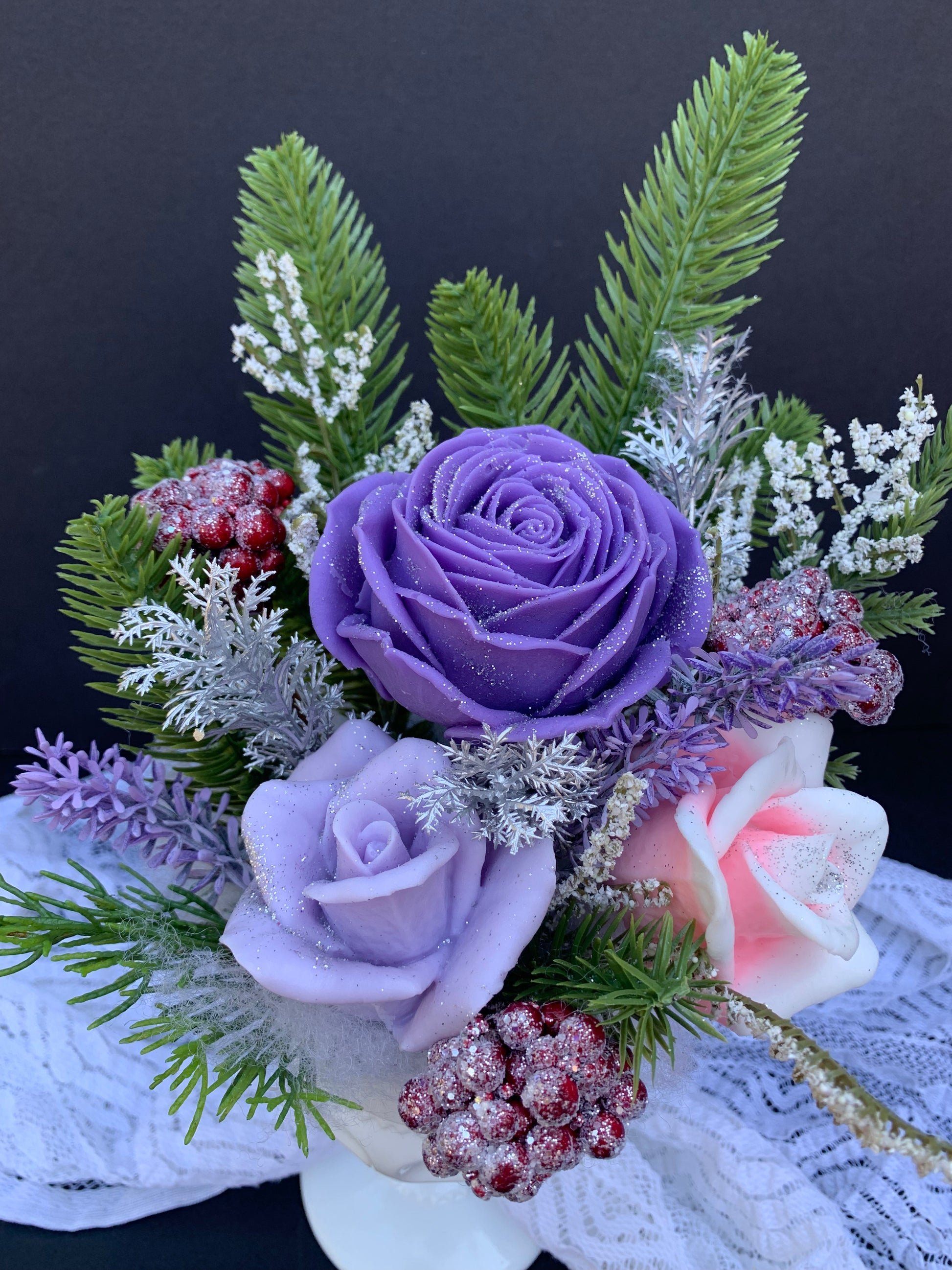 - This rich arrangement with purple soap roses, frosted red berries, silver branches and green christmas tree brunches is perfect to decorate your home for the Holidays.