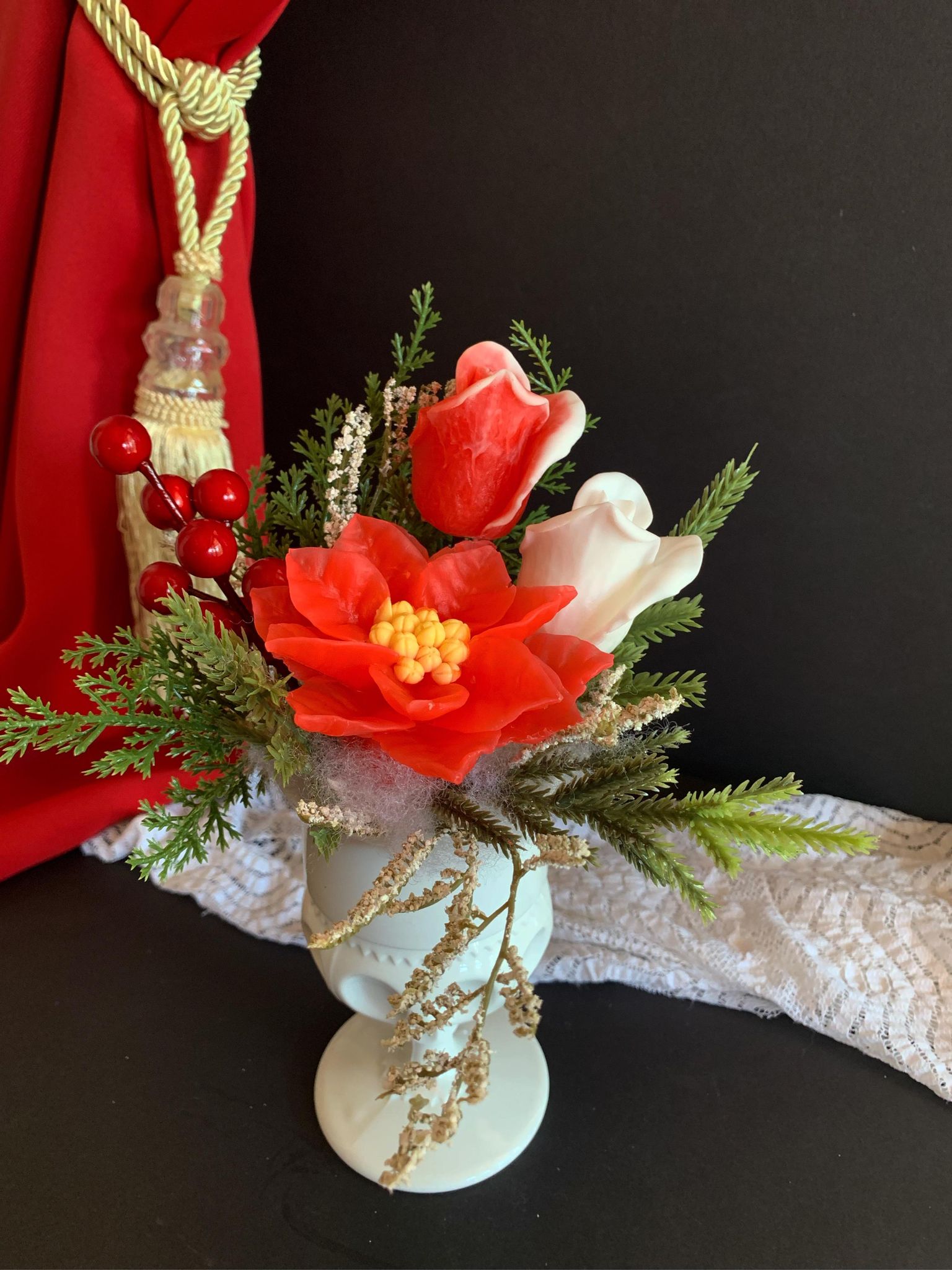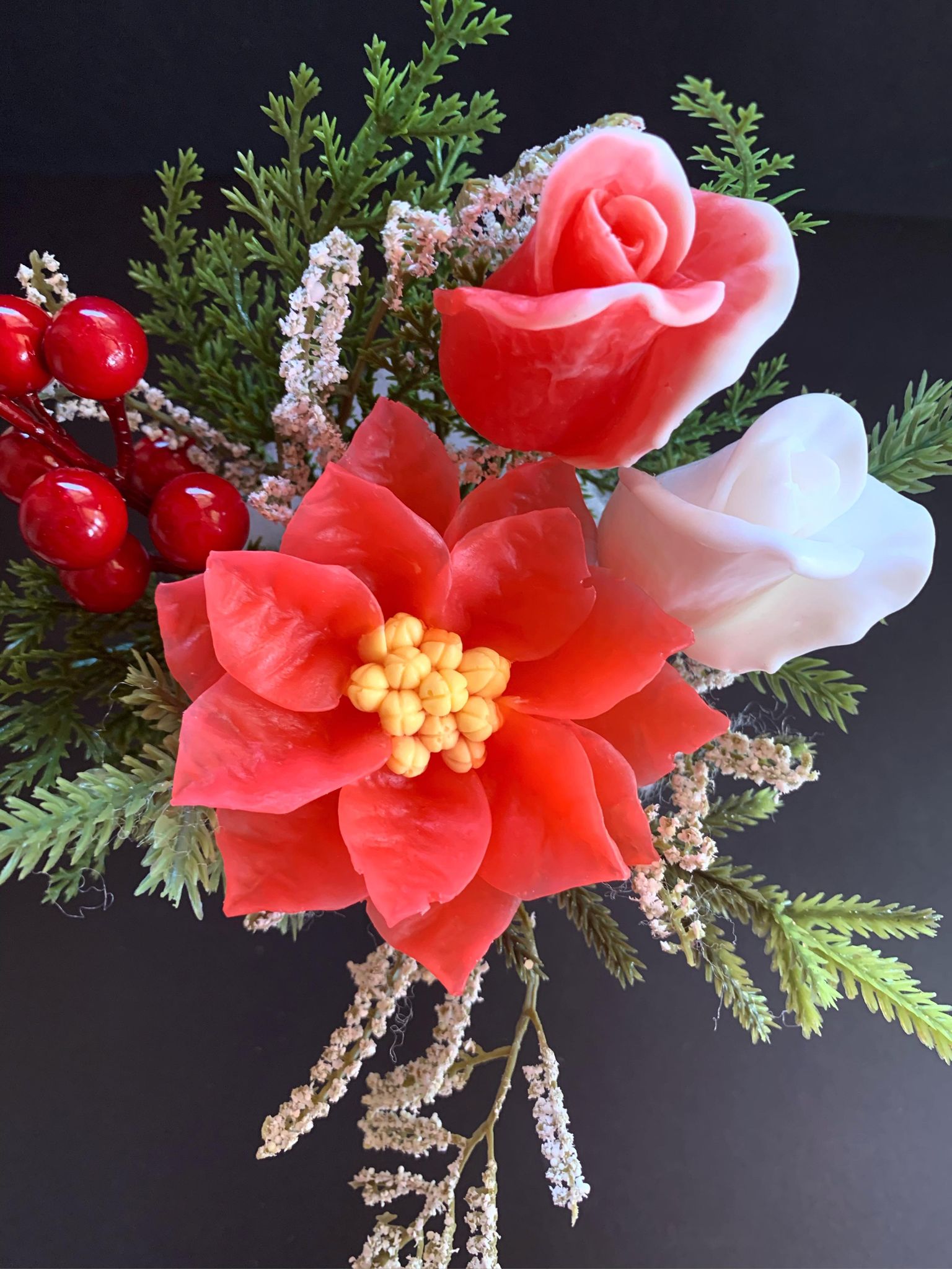 - This Christmas arrangement with poinsettia soap roses, red berries and greenery is perfect to decorate your home for the Holidays.