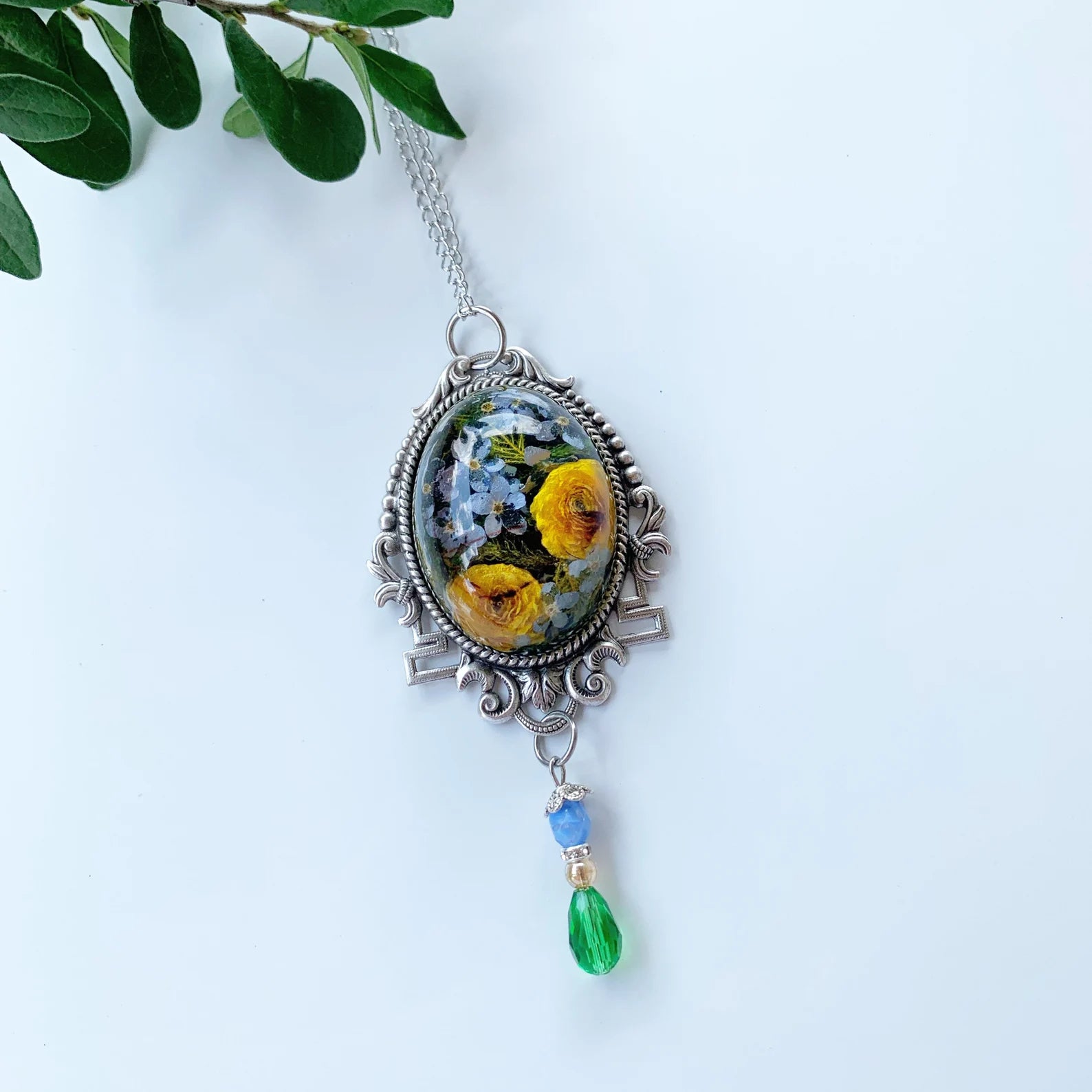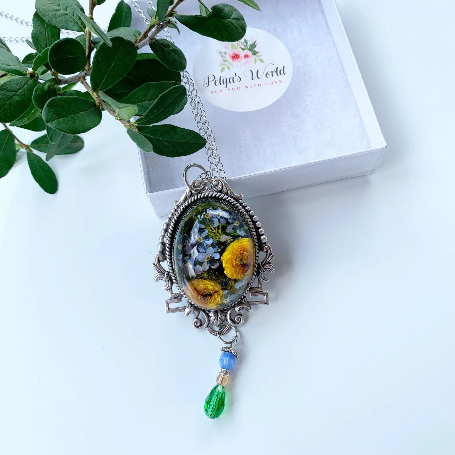 Forget me not flower necklace, Victorian style real flowers necklace, Terrarium necklace