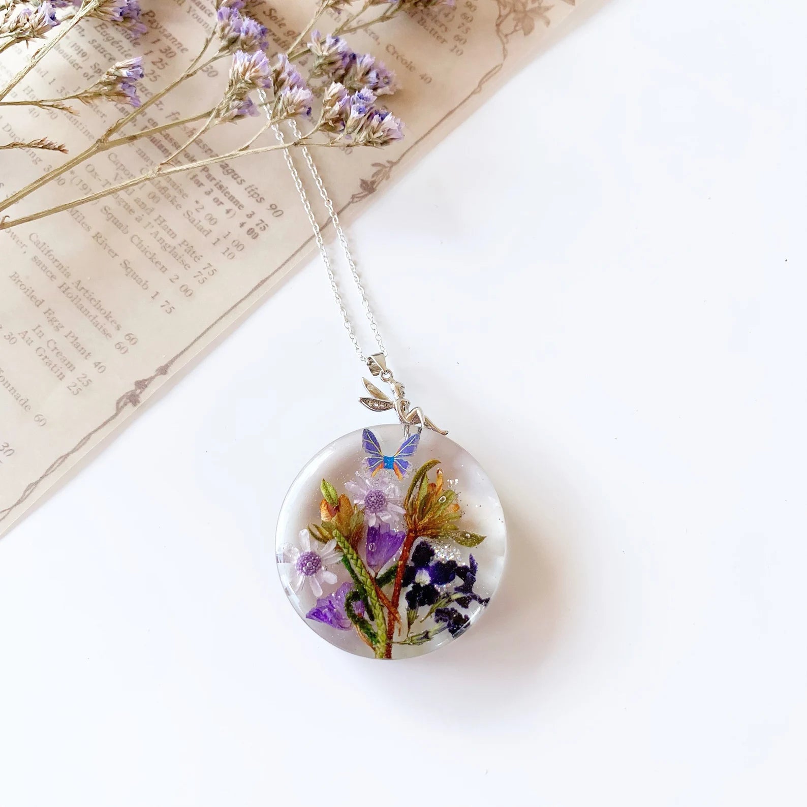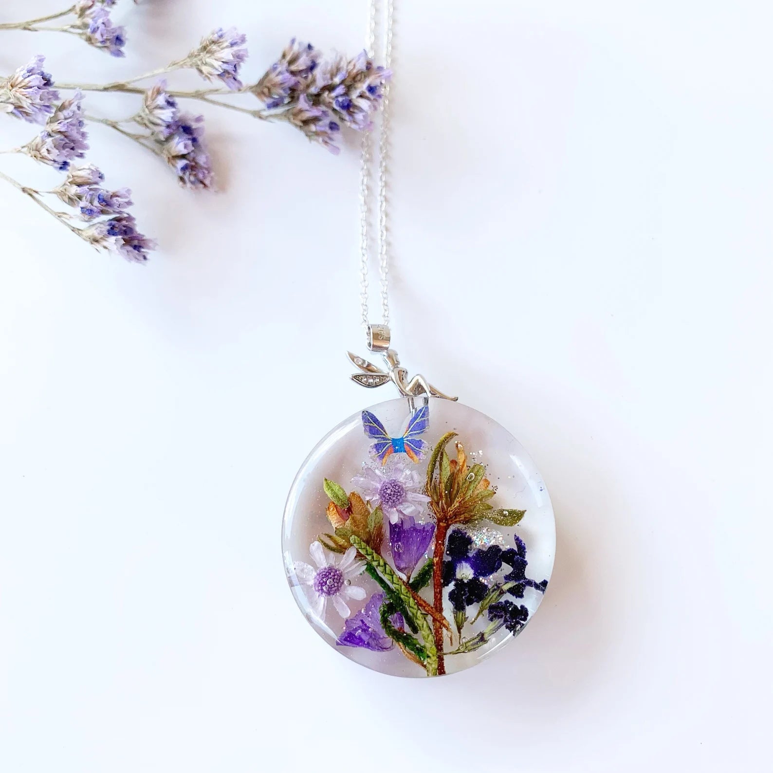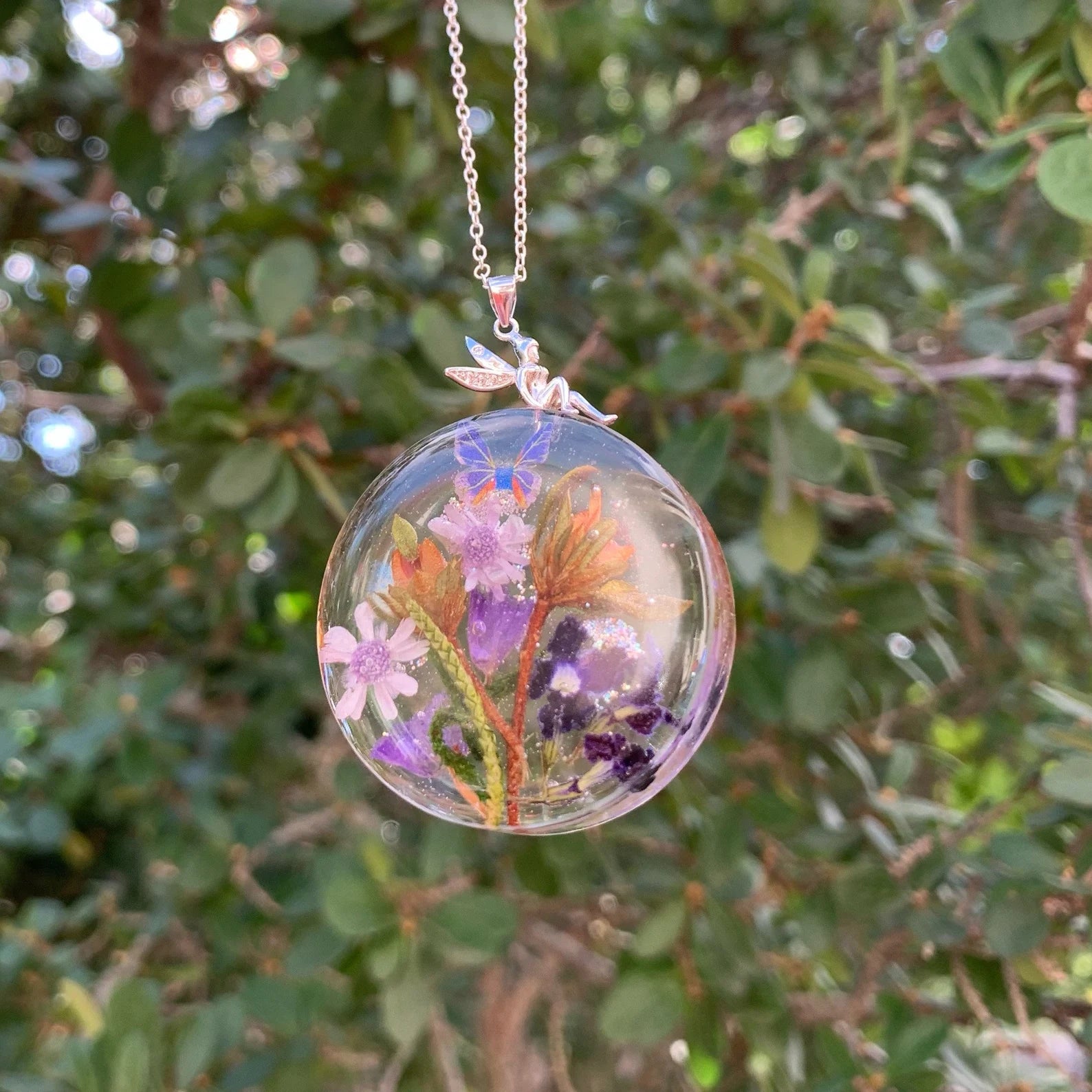 Real flowers necklace, Fairy necklace 925 sterling silver, Butterfly necklace, Woodland necklace, Moss necklace
