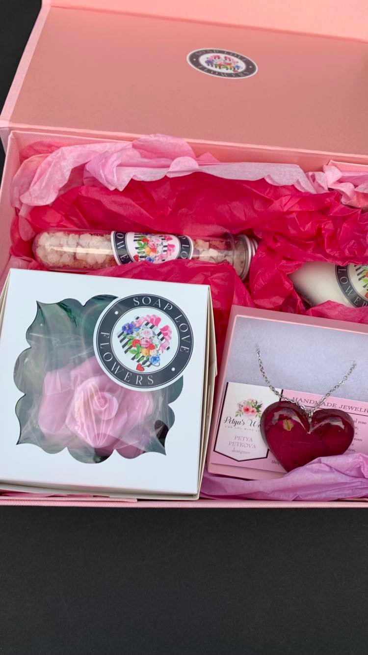 The set include rose flower soap, Italian sea salt infused with rose essential oil and real rose petals, aromatic candle infused with white tea and ginger and heart shaped necklace made with real rose petals.