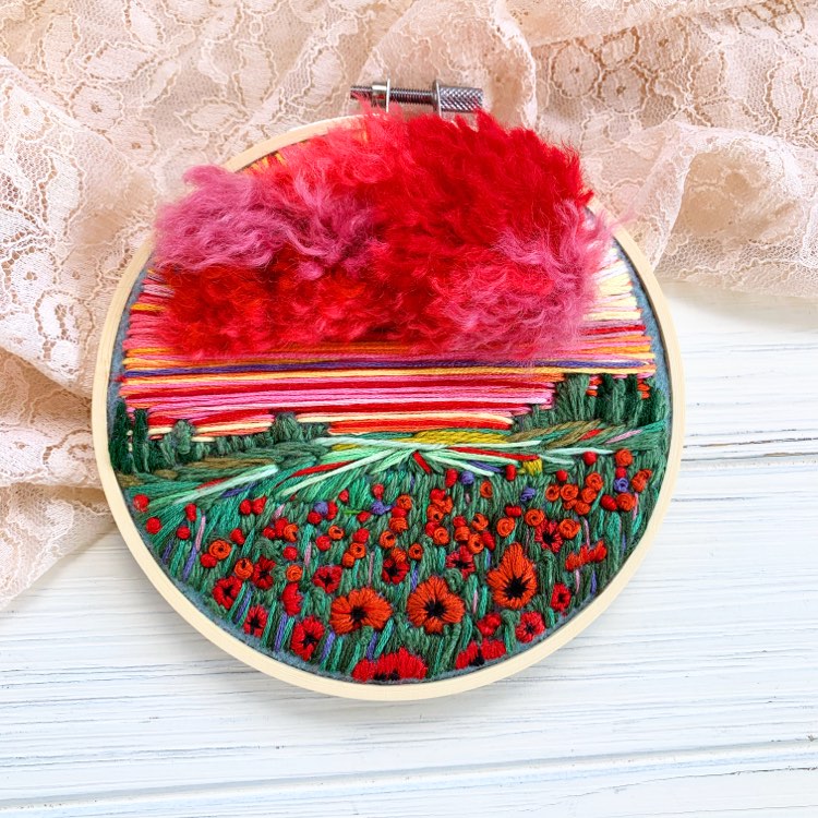 Summer sunset embroidery, Poppies embroidery, Landscape embroidery, Scenery embroidery design